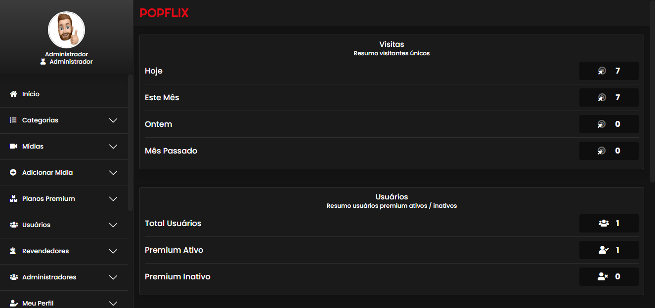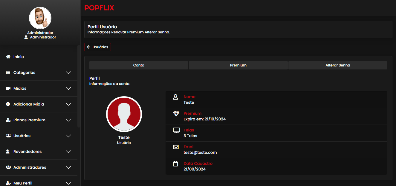 O sistema tem os campos de Usuários, Cadastro de filmes e cadastro de séries.